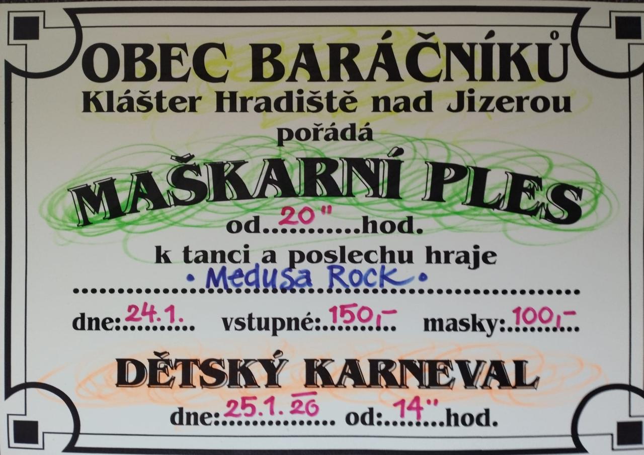 Obec Baráčníků Klášter Hradiště nad Jizerou pořádá 24. 1. od 20 hodin maškarní ples a 25.1. od 14 hodin dětský karneval.